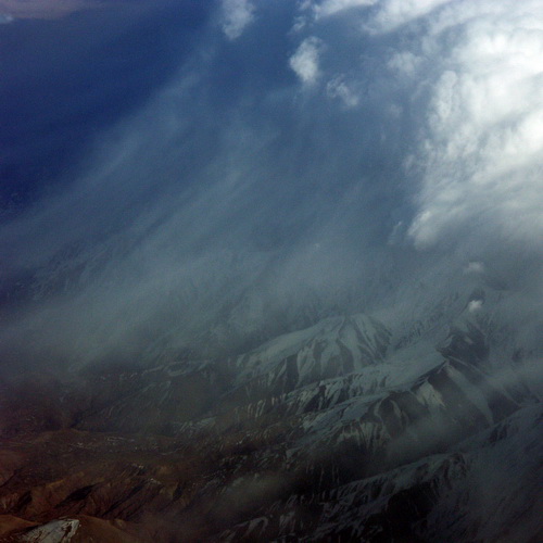 Nordiran Feuchte Luft steigt an den Bergen östlich des Urmia-Sees auf und kondensiert zu dichten Wolken. Auf der anderen Seite der Berge kann die Luft wieder absinken und erwärmt sich dabei: Die Wolken lösen sich in dünnen Schleiern auf. |