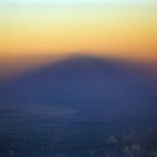 Mit der aufgehenden Sonne genau im Rücken, liegt der Erschatten wie ein dunkler Kegel auf der Leinwand der Stratosphäre. Knapp oberhalb der Schatten des Flugzeugs mit der feinen Linie des Kondensstreifens.
