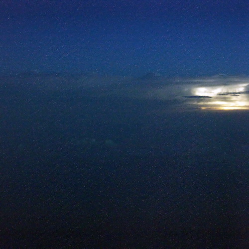 Near dawn, numerous flashes illuminate late summer thunderstorms from within.