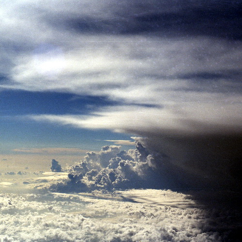 The summits of the Alps force the advancing, humid air upwards, thereby creating a cloudy extension of their ridges. This solid wall of clouds accompanies the flight from east to west.