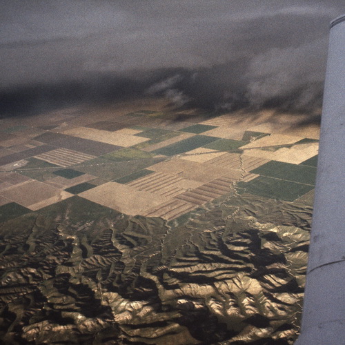 Im San Joaquin Valley grenzt ein dichtes Muster rechteckiger Felder an die vom Wasser zahlreicher Regenfälle zerklüfteten Hänge der Coastal Range.