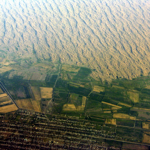 Ein schmaler Gürtel bewässerten Ackerlandes trennt die gleichförmigen Straßen einer Siedlung bei Ashgabat von einer unfruchtbaren Wüstenlandschaft.