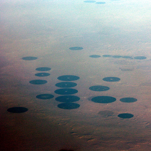West of the coastline near Bahrain, circular, dark green fields give testimony of attempts to make use of the desert soil.