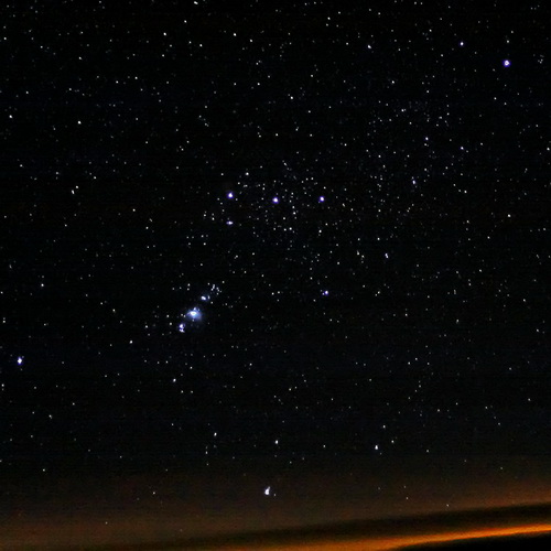 Schwarzes Meer In einer mondlosen Nacht zeigen sich aus der Stratosphäre tausende Sterne, so auch das Sternbild Orion. Der Widerschein am Horizont ist nicht die Dämmerung, sondern das Licht der Städte an der rumänischen Schwarzmeerküste. » Rücksichten: Orionnebel |
