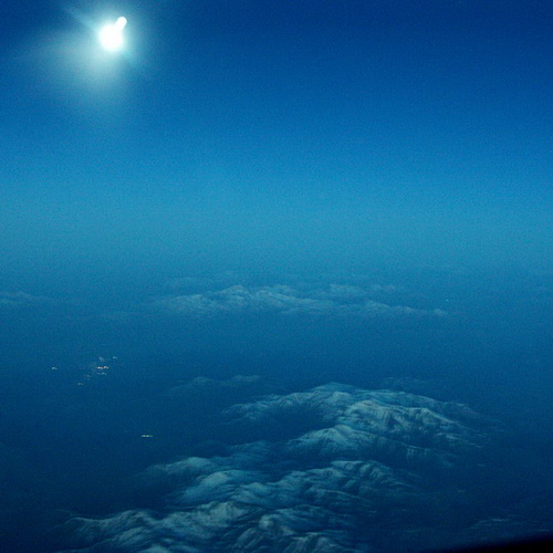 Ende April spiegeln die letzten Schneereste im anatolischen Hochland das Mondlicht wieder. Die leichte Unschärfe im Vordergrund entsteht durch die Vorwärtsbewegung des Flugzeugs während der Belichtung.