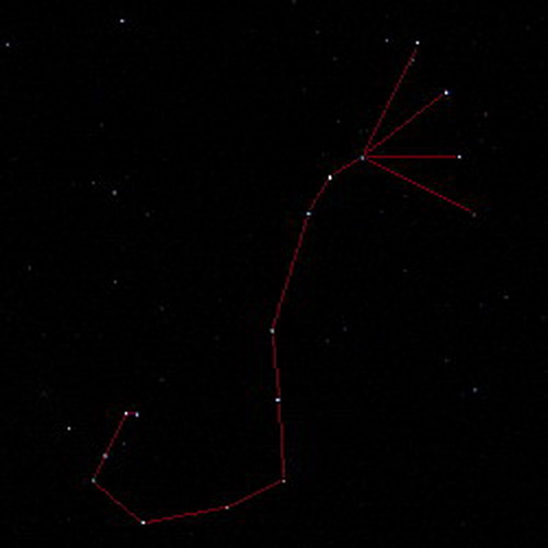 A constellation of the southern sky, Scorpius is fully visible in this flight deck view: The scissors outstreched in the top right corner, attached the long body, leading to curved sting in the lower left. The brightest star gives a slightly reddish light and is called Antares, meaning Anti-Mars.