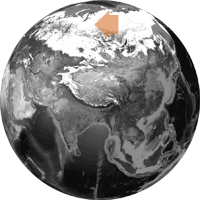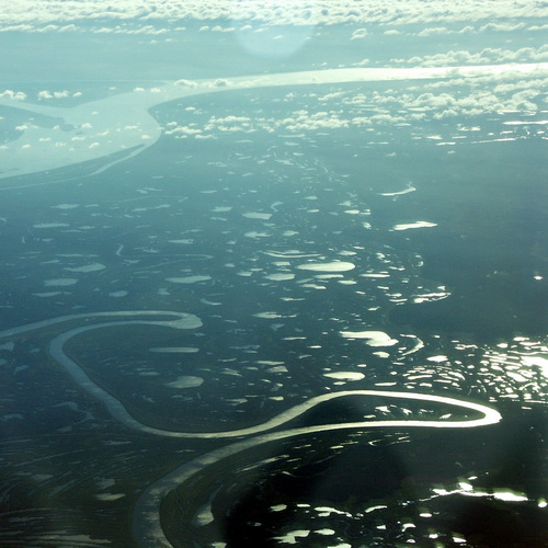 Im Sommer taut die oberste Schicht des Tundrabodens auf, und nur im Gegenlicht zeigt sich das Land als endloses Sumpfgebiet. In der Ferne das breite Bett des Jenessei.