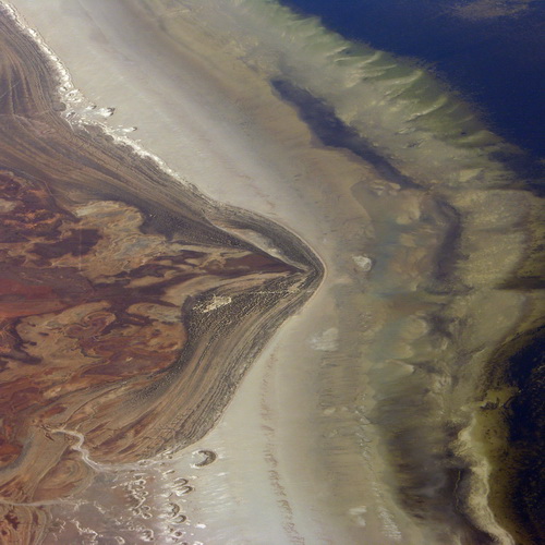 Der Küstenverlauf hier im Spencergolf nahe Adelaide zeugt von einer ausgleichenden, nahezu parallel zur Küste verlaufenden Strömung, die ein Linienmuster im Strandbereich hinterlassen hat.