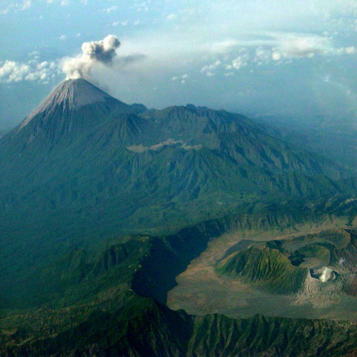 Wie einen Gruß entläßt der Gunung Semeru, mehr als 3600 Meter hoch, eine Rauchwolke in die morgendliche Atmosphäre.