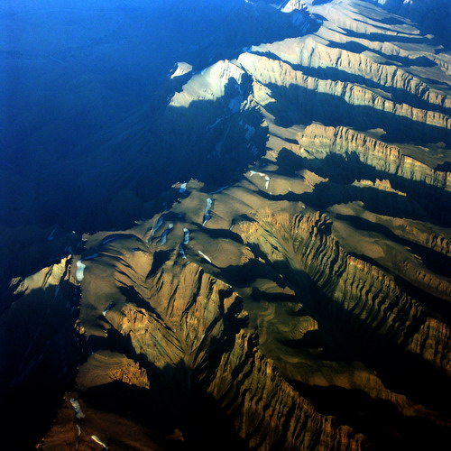 In den Bergen westlich von Kabul halten sich einzelne Schneflecken bis weit in den Sommer hinein. Kämme aufgeschichteten Gesteins brechen jäh ab; die Schlucht selbst liegt bereits in Dunkelheit.