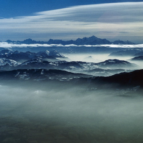 Der höchste Berg der Alpen, der Mont Blanc, erhebt sich mit seiner vergletscherten Nordseite weit über dem winterlichen Tal der Rhône.