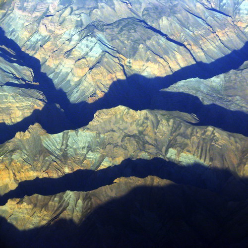 Die abendlichen Schatten der afghanischen Berge verbergen den Grund der tief eingeschnittenen Schluchten.