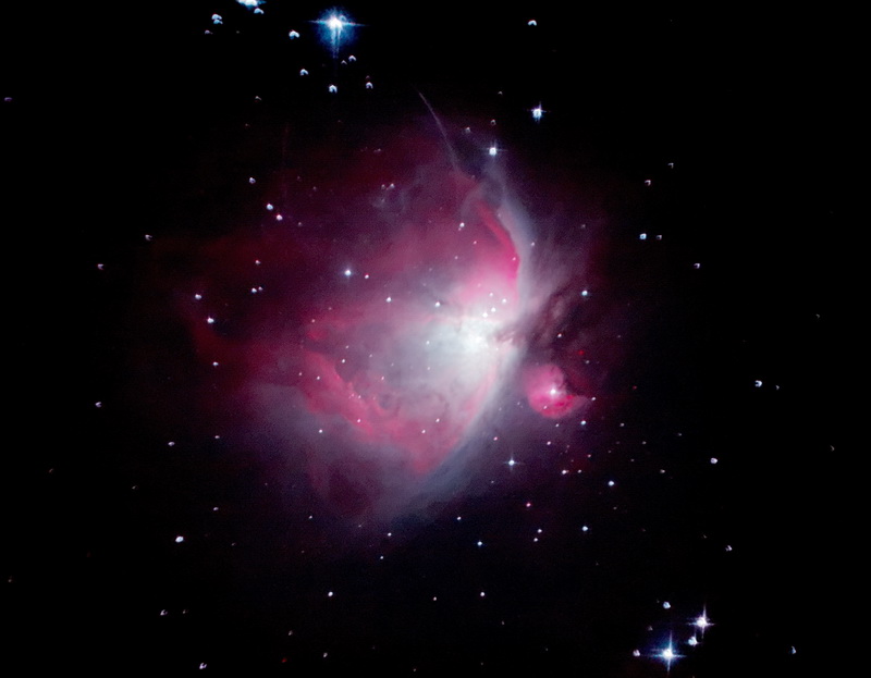 M42 & M43 / NGC1976 & NGC1982 Schon auf dem Bild ist zu erahnen, dass sich hier, wenn auch für menschliche Maßstäbe immer noch unendlich langsam, dynamische Veränderungen ereignen, Wasserstoffgas sich verdichtet, zusammenballt, bis Druck und Dichte schließlich die Kernverschmelzung in Gang setzen und neue Sterne entstehen. |