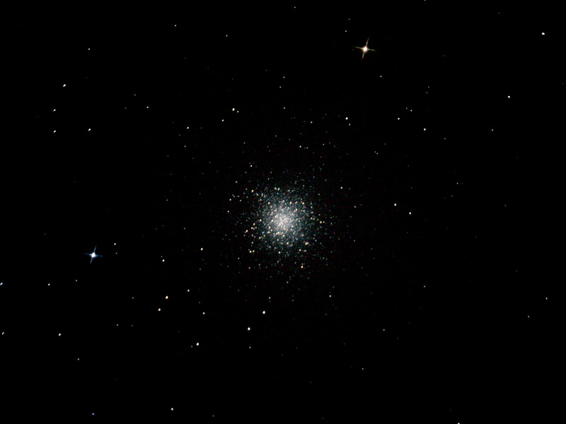 M13 / NGC 6205, Sternbild Herkules Absonderliche Gebilde, diese Kugelsternhaufen. Sie sind sehr alt, einige Milliarden Jahre älter äls die Sonne, so alt wie unsere Galaxis, und am erstaunlichsten ist ihre – nach unserern Maßstäben natürlich unendlich langsame – Bewegung: Statt das Zentrum unserer Galaxis in einer Ebene zu umkreisen, durchqueren sie die Scheibe, werden auf der anderen Seite langsamer, kehren dann um, um sie erneut zu durchqueren, in einer gewaltigen, pendelnden Bewegung. Wer weiß, ob es im sternreichen Raum innerhalb der Kugelsternhaufen Planeten gibt? Wenn ja, würden sie die Dunkelheit kaum kennen, weil die Nacht von zigtausend Sternen erfüllt wäre, die heller strahlten als der Planet Venus bei uns auf der Erde. |